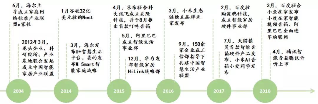 早期的中國智能家居市場受制于技術和市場環(huán)境,盡管有龍頭企業(yè)和科研院所等大力推動,但一直是不瘟不火。直到2014年谷歌以32億美元收購Nest的事件引爆全球的智能家居產(chǎn)業(yè),同年的美國CES上,三星和LG也推出了各自的智能家居平臺。在此背景下,智能家居的熱度席卷至國內(nèi)市場,除最早進入的一批家電企業(yè)外,消費電子、互聯(lián)網(wǎng)公司以及運營商等產(chǎn)業(yè)鏈中的關聯(lián)方也紛紛進場,或自研智能硬件,或布局生態(tài)平臺。不同類型企業(yè)間的跨界合作和開放生態(tài)成為智能家居市場的主流。亞馬遜Echo的成功讓國內(nèi)市場開始聚焦智能音箱這一入口級產(chǎn)品,2017年下半年開始的入口爭奪戰(zhàn)的背后,是巨頭公司對整個智能家居生態(tài)的野心。