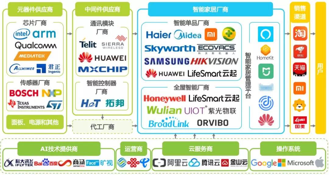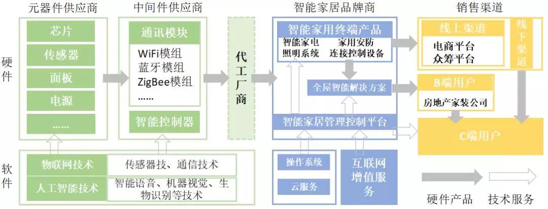 通常所指的智能家居企業(yè)為智能家居品牌商,涵蓋向最終用戶提供終端產(chǎn)品、解決方案和設備管理控制平臺的企業(yè),底層除物聯(lián)網(wǎng)操作系統(tǒng)、云服務作為管理控制平臺的支撐外,還包括內(nèi)容服務、生活服務等互聯(lián)網(wǎng)增值服務。智能家居產(chǎn)業(yè)鏈上游主要是芯片、傳感器等元器件供應,以及通訊模塊和智能控制器等中間件供應商。品牌商可以通過線上、線下零售渠道直接向C端用戶銷售終端產(chǎn)品,也可以面向房地產(chǎn)、家裝公司等B端客戶提供整體解決方案。