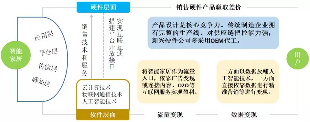 將智能家居劃分為硬件和軟件兩個層面,其中硬件對應于智能家居的應用層,軟件對于智能家居的平臺層、傳輸層和感知層。硬件產(chǎn)品的品牌方專注于產(chǎn)品側(cè)的設計和制造,向終端用戶提供的是智能家居的物理屬性,通過銷售硬件賺取差價實現(xiàn)盈利。針對智能家用產(chǎn)品的云計算、物聯(lián)網(wǎng)通信和人工智能三項核心技術,技術供應商通常會提供其中的一項或多項能力。他們既可以選擇直接通過向硬件廠商銷售技術和服務變現(xiàn),也可以選擇以硬件產(chǎn)品連接到海量的終端用戶,利用獲取到的用戶流量和數(shù)據(jù),通過面向消費者的互聯(lián)網(wǎng)服務和面向企業(yè)的數(shù)據(jù)服務進行變現(xiàn)。