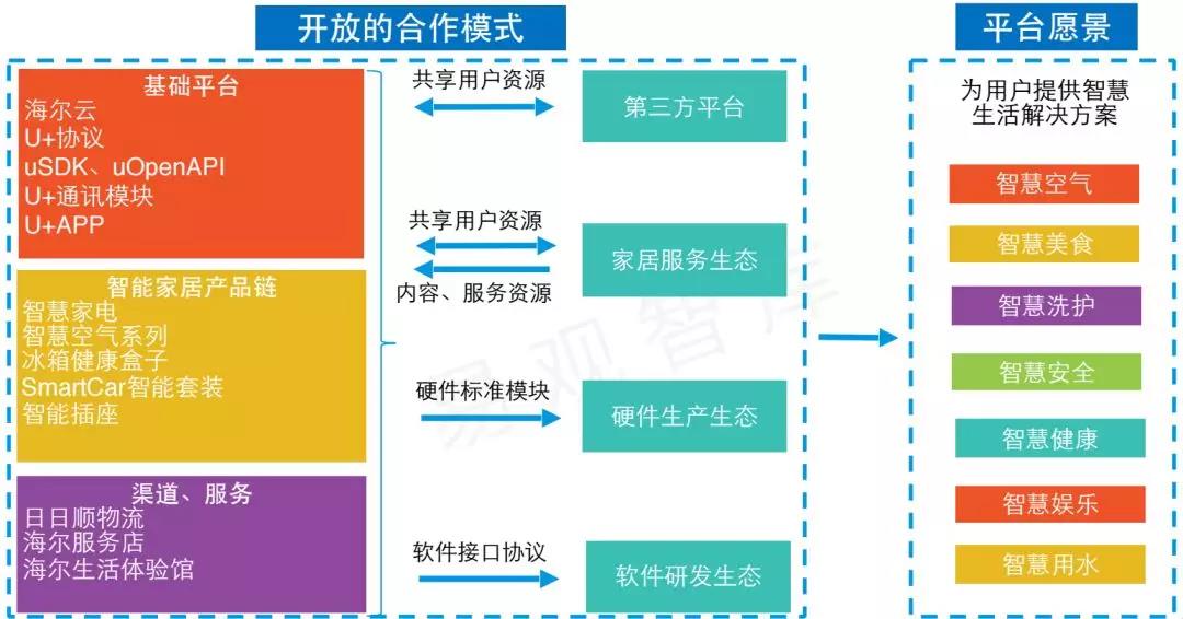 海爾U+智慧生活平臺是海爾集團旗下全開放、全兼容、全交互的智慧生活平臺。海爾作為最早布局智能家居市場的企業(yè),自2014年發(fā)布U+智慧生活戰(zhàn)略以來,海爾U+從智能家電產(chǎn)品出發(fā)逐步構建起全場景智慧生活解決方案。通過與美國GE Appliances、新西蘭Fisher & Paykel、卡薩帝、統(tǒng)帥、日本AQUA等品牌整合,其智能產(chǎn)品體系覆蓋基本全面。