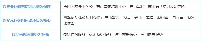 在法國,登山向?qū)?duì)顧客的行為承擔(dān)法律責(zé)任,這些以技術(shù)高超、經(jīng)驗(yàn)豐富,責(zé)任感強(qiáng)而著稱的向?qū)冊(cè)谌澜缍枷碛惺⒆u(yù)。國立登山滑雪學(xué)校開設(shè)的項(xiàng)目有登山向?qū)?、滑雪教練、高山協(xié)作、救援、滑翔傘教練。學(xué)校設(shè)備齊全,配有六個(gè)可容納20至80人的會(huì)議室、一個(gè)可容納220人且配有錄像投影機(jī)的階梯教室、一棟配有132個(gè)標(biāo)間的宿舍樓、一個(gè)自助餐中心、一個(gè)健身房、一個(gè)器材室及其它科研場所。因?yàn)?/b>ENSA的存在,沙木尼成為全球登山標(biāo)準(zhǔn)的定制者,完善的培訓(xùn)和卓越的服務(wù)成為其登山產(chǎn)業(yè)發(fā)展的護(hù)城河。