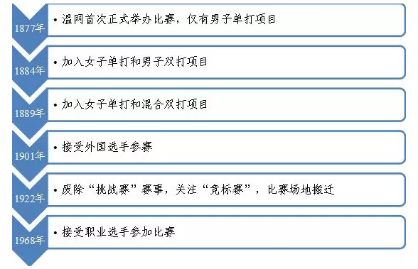 溫網(wǎng)于1877年首次于全英草地網(wǎng)球和門球俱樂部管理之下在溫布爾登Worpl路附近的一塊場地舉行,當(dāng)時(shí)僅有男子單打比賽。1884年,全英俱樂部增加了女子單打和男子雙打比賽,女子雙打和混合雙打則在1889年加入。1922年比賽搬遷到到了如今的Church路場地。如同其他3項(xiàng)“大滿貫”賽事,溫布爾登在1968年網(wǎng)球公開時(shí)代到來之前,只對(duì)頂級(jí)的業(yè)余選手開放。而之后,溫網(wǎng)是所有職業(yè)選手的圣地。