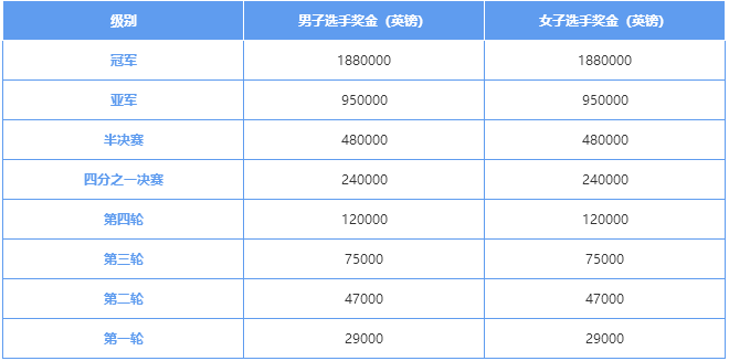 溫網(wǎng)不斷攀升的獎(jiǎng)金也是吸引選手參賽的一大因素。1984年,溫網(wǎng)男子單打冠軍獎(jiǎng)金為10萬英鎊,女子單打冠軍為9萬英鎊;1985年男單冠軍為13萬英鎊;1987年男單冠軍獎(jiǎng)金為15.5萬英鎊;1991年男單冠軍獲24萬英鎊,女單冠軍獲21.6萬英鎊,甚至第1輪遭淘汰選手也可獲得一筆獎(jiǎng)金,男子3600英鎊,女子2790英鎊。如今,溫網(wǎng)已經(jīng)實(shí)現(xiàn)了男女運(yùn)動(dòng)員獎(jiǎng)金持平政策,每年共有2700萬磅獎(jiǎng)金,已經(jīng)超過美網(wǎng)(2600萬磅)、澳網(wǎng)(2300萬磅)、法網(wǎng)(2200萬磅)成為獎(jiǎng)金最多的公開賽。