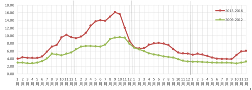 生姜是典型的一年生產(chǎn)、常年銷售的農(nóng)產(chǎn)品,一般于驚蟄后、清明前定植,隨產(chǎn)地由北至南依次上市,遼寧、河北等地為9月中旬,山東及周邊地區(qū)為10月中旬,南方產(chǎn)區(qū)則在立冬之后。相應(yīng)地,全年生姜價格趨勢會在當(dāng)年新生姜上市前后表現(xiàn)出不同特點。作為小宗農(nóng)產(chǎn)品,生姜市場容量小,農(nóng)戶分散庫存量大,易發(fā)跟風(fēng)行為,誘發(fā)價格大幅波動,影響周期長,對姜農(nóng)、貿(mào)易商、消費者均產(chǎn)生不利影響。