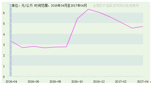 據(jù)全國農(nóng)產(chǎn)品批發(fā)市場價格信息網(wǎng)提供數(shù)據(jù),2016年4月至2017年4月,寧夏生姜價格趨勢與我國生姜價格總趨勢保持一致,如圖5所示。區(qū)內(nèi)生姜價格最高價出現(xiàn)在2016年12月15日,為7.2元/公斤,由吳忠市鑫鮮農(nóng)副產(chǎn)品市場有限公司上報;市場最低價出現(xiàn)在2016年6月15日,為2.3元/公斤,由銀川北環(huán)批發(fā)市場上報。