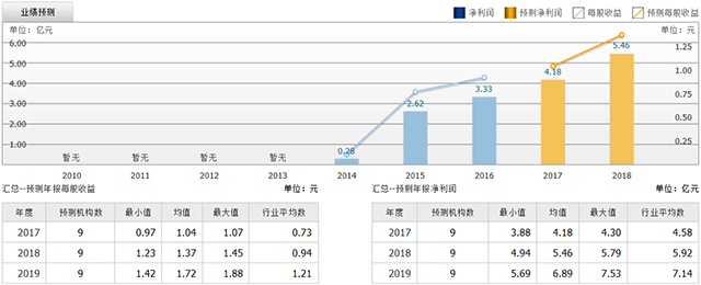 截至2017年7月17日,6個(gè)月以內(nèi)共有 9 家機(jī)構(gòu)對(duì)華大基因的2017年度業(yè)績作出預(yù)測(cè);預(yù)測(cè)2017年每股收益 1.04 元,較去年同比增長 13.04%,預(yù)測(cè)2017年凈利潤 4.18 億元,較去年同比增長 25.53%。