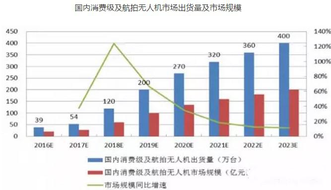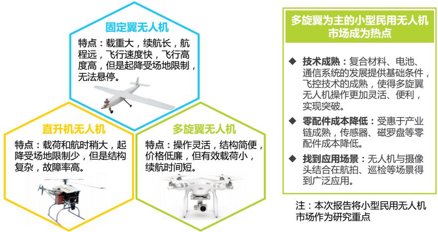隨著技術(shù)成熟,零配件成本降低,并且開發(fā)了航拍、電力巡檢等應(yīng)用場景,以多旋翼無人機為主的小型民用無人機市場成為熱點。