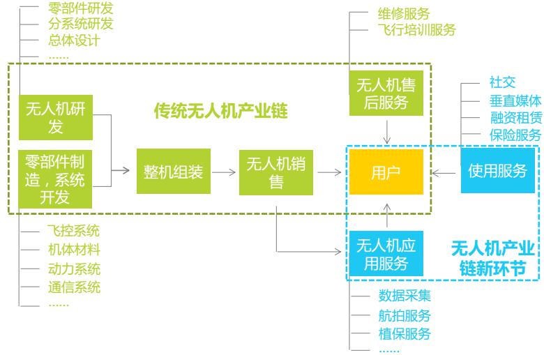 無人機產(chǎn)業(yè)鏈除了傳統(tǒng)的生產(chǎn)制造環(huán)節(jié)外,還出現(xiàn)了針對用戶使用過程的社交、保險以及數(shù)據(jù)采集、航拍等基于應(yīng)用場景的產(chǎn)業(yè)服務(wù)。