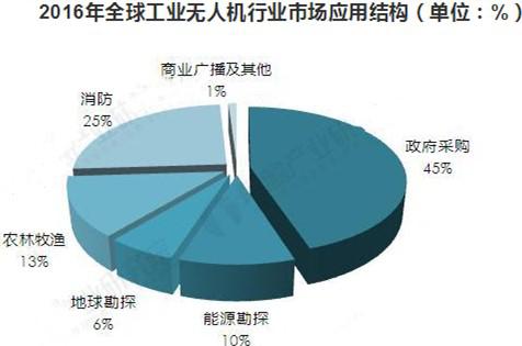 從應(yīng)用結(jié)構(gòu)來看,當前全球工業(yè)無人機行業(yè)中45%為政府采購,能源勘探和地球勘探的應(yīng)用占比分別為10%和6%,農(nóng)林牧漁的應(yīng)用占比約為13%,在消防領(lǐng)域的應(yīng)用占比達到25%。