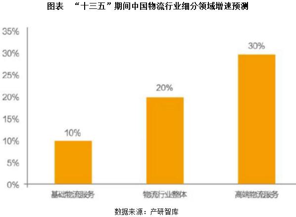 而高端物流服務增速將可以達到30%以上的增長。供應鏈管理、專業(yè)第三方物流和冷鏈服務等高端業(yè)態(tài)將迎來快速發(fā)展期,考慮到物流行業(yè)整體增速可以達到20%以及基礎物流服務增速僅在10%左右,預計“十三五”期間高端物流服務將可以迎來年均30%左右的持續(xù)增長。