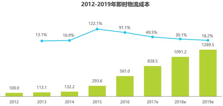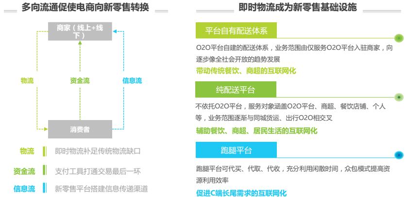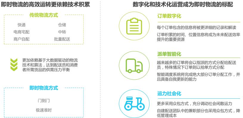 快速、及時、實時的物流實現(xiàn)路徑是“新零售” 的必備條件,即時物流在居民生活中扮演著越來越重要的角色,物流能力向下滲透觸及居民生活的方方面面,為衣食住行的全方位互聯(lián)網(wǎng)化提供現(xiàn)實基礎,未來新零售趨勢下的即時需求比重會逐步增加。