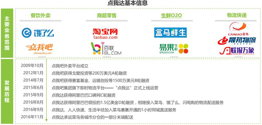 即時物流平臺點我達脫胎于外賣平臺點我吧,憑借出色的運營和調(diào)度能力快速發(fā)展。2016年7月,獲得阿里領投的1.5億美金D輪融資,并接入菜鳥網(wǎng)絡城市配送體系,成為阿里物流布局戰(zhàn)略重點。相較于其他即時物流平臺,點我達擁有淘系電商龐大的資源背景作為支撐,訂單來源除O2O平臺之外還包括物流、電商等,在競爭中占據(jù)絕對優(yōu)勢。