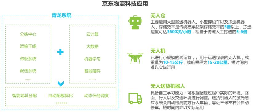 京東于2016年成立了X事業(yè)部,專注智慧物流相關技術的研發(fā)。2017年4月京東物流宣布獨立運營,成立物流子公司。截止2017年6月,京東在全國范圍內(nèi)擁有256個大型倉庫,6906個配送站和自提點,包括已經(jīng)運營了7個大型智能化物流中心“亞洲一號”。目前京東自營配送覆蓋了全國98%的人口,壓縮商品流通成本70%,提升物流運營效率2倍以上。京東物流科技的應用主要包括兩個方面,一是基于大數(shù)據(jù)預測分析技術實現(xiàn)智能化的調(diào)度、決策;二是采用一些更自動化、智能化的設備提升物流效率,最終提升客戶的體驗。