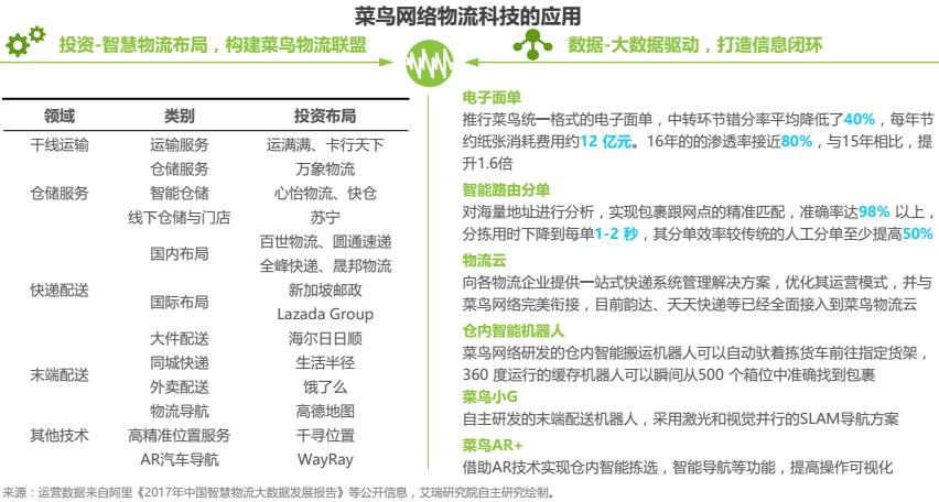 菜鳥網(wǎng)絡成立于2013年5月,定位于以數(shù)據(jù)驅動、社會化協(xié)同的物流及供應鏈平臺。主要業(yè)務有倉配網(wǎng)絡、跨境網(wǎng)絡、快遞平臺和ET.物流實驗室,以覆蓋全國的倉配網(wǎng)絡和大數(shù)據(jù)決策平臺為基礎,構建專業(yè)高效的供應鏈服務。為了提高網(wǎng)絡效率,一方面菜鳥以投資參股的形式構建菜鳥聯(lián)盟,另一方面加大科技研發(fā)的投入,積極布局智慧物流。