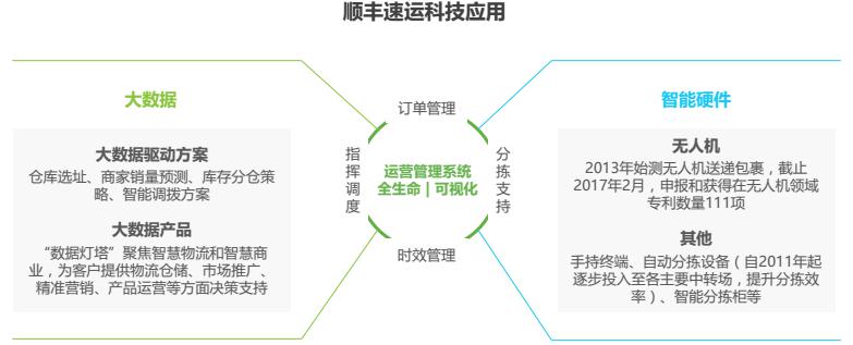順豐速運成立于1993年,截止2016年12月,順豐控股業(yè)務覆蓋全國331個地級市、2620個縣區(qū)級城市,近13000個自營網(wǎng)點。順豐速運業(yè)務包括國際業(yè)務、同城配送、冷運、重貨(陸路&航運)等。順豐一貫重視在信息化領域的投入,負責集團信息系統(tǒng)研發(fā)與運維的科技人員超過2,000名,16年信息技術費投入2.6億、占營業(yè)成本0.57%,相較15年提升0.08個百分點。14-16年來,順豐控股申報和獲得的專利523項,軟件著作權200多項。未來,順豐還將繼續(xù)擴大在科技領域投入,不斷提高各方面的科技與智能化水平。