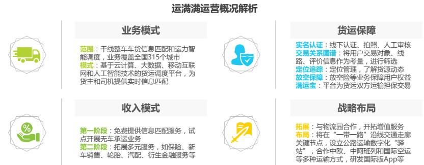 運滿滿成立于2013年,是基于云計算、大數(shù)據(jù)、移動互聯(lián)網(wǎng)和人工智能技術開發(fā)的貨運調(diào)度平臺,為貨主和司機提供實時信息匹配,減少貨運空載率、提高物流運行效率。由于模式相近,運滿滿被業(yè)界稱為“貨運版的滴滴”,成立3年來共獲得7輪融資,目前估值超過10億美金。截止2017年9月底,平臺實名注冊重卡司機400余萬、貨主100余萬,業(yè)務覆蓋全國 315 個城市。運滿滿最新推出擔保交易產(chǎn)品“滿運寶”,為貨運雙方提供運費擔保。此外,運滿滿還與阿里云、菜鳥、螞蟻金服、平安保險、中國聯(lián)通、中國重汽等開展深度戰(zhàn)略合作,通過跨界融合,不斷推出創(chuàng)新產(chǎn)品和服務。未來,運滿滿將借助人工智能、無人駕駛、區(qū)塊鏈等技術驅動,提供貫穿全產(chǎn)業(yè)鏈的線上線下服務,構建公路物流生態(tài)圈,打造綜合性的貨運平臺。
