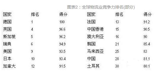 國家的物流業(yè)總體競爭力不僅取決于基礎設施建設水平,還取決于整個物流產(chǎn)業(yè)的管理水平、第三方物流企業(yè)發(fā)展水平和第四方物流企業(yè)的整合能力。從國家層面來看,世界銀行發(fā)布的報告顯示,在全球物流業(yè)競爭力排行榜(Logistics Performance Index)中,歐洲國家表現(xiàn)最為突出,前20名中超過60%的企業(yè)來自歐洲,亞洲物流業(yè)競爭力最強的國家/地區(qū)是日本(排名第十),其次為中國香港和臺灣地區(qū),中國大陸在全球僅排名第28。總體而言,發(fā)展中國家在基礎設施、國際運輸、物流能力、交貨及時性等方面還與歐美等發(fā)達國家存在較大的差距,物流業(yè)的全球競爭能力還十分有限。