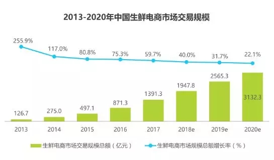2017年中國生鮮電商市場(chǎng)交易規(guī)模約為1391.3億元,同比增長59.7%,預(yù)計(jì)2020年,生鮮電商交易規(guī)??梢赃_(dá)到3132億元。一方面基于消 費(fèi)者消費(fèi)習(xí)慣養(yǎng)成,另一方面基于冷鏈和倉儲(chǔ)系統(tǒng)迅速完善。