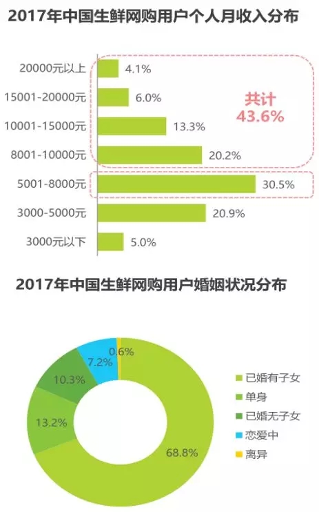 從用戶屬性來看,體驗(yàn)過創(chuàng)新模式的用戶中高學(xué)歷、高家庭月收入的人群占比均高于整體生鮮網(wǎng)購用戶,與創(chuàng)新模式中高端消費(fèi)者的定位相吻合。體驗(yàn)過創(chuàng)新模式的用戶中78.2%擁有大學(xué)本科及以上學(xué)歷,80.7%的用戶家庭月收入在10000元以上,其中家庭月收入在10001-15000元的用戶最多,占比達(dá)28.2%。