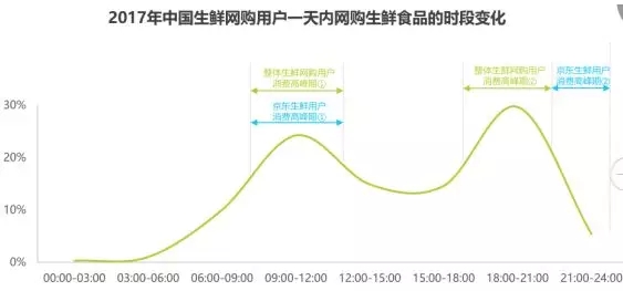 從消費(fèi)時(shí)間來看,生鮮網(wǎng)購用戶購物的活躍曲線在09:00-12:00和18:00-21:00出現(xiàn)波峰,這兩個(gè)時(shí)間段分別對(duì)應(yīng)午餐前和晚餐前的使用時(shí)段,用戶可能選擇這兩個(gè)時(shí)間段網(wǎng)購午餐和晚餐所需要的食材。京東生鮮用戶消費(fèi)的第一段高峰期和整體用戶基本一致,第二段高峰期時(shí)間為晚間21:00-22:00,相對(duì)靠后。艾瑞分析認(rèn)為,京東生鮮B2C模式目前主要為次日達(dá),用戶在平臺(tái)購買即時(shí)性晚餐食材的需求較小。