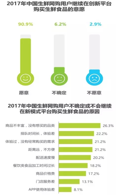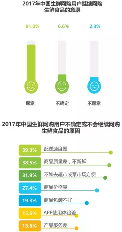 九成以上用戶愿意繼續(xù)網(wǎng)購生鮮食品,配送速度慢和品質(zhì)問題是用戶不確定或不會(huì)繼續(xù)購買的主因。
