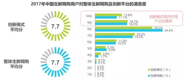 用戶對(duì)創(chuàng)新模式整體較為滿意,滿意度與整體生鮮網(wǎng)購基本持平,高評(píng)價(jià)用戶占比略多。