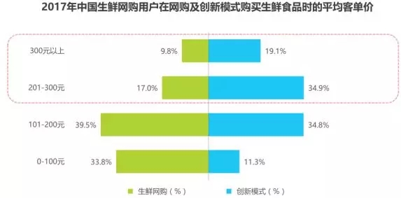 從消費(fèi)金額來看,用戶在創(chuàng)新模式消費(fèi)的單均價(jià)明顯高于生鮮網(wǎng)購整體,超過50%的用戶在創(chuàng)新模式消費(fèi)的單均價(jià)超過200元。其中,19.1%的用戶在創(chuàng)新模式消費(fèi)單均價(jià)超300元,而這一比例在整體生鮮網(wǎng)購平臺(tái)僅9.8%。34.9%的用戶在創(chuàng)新模式的客單價(jià)在201-300元之間,僅有17.0%的整體生鮮網(wǎng)購用戶客單價(jià)在這一區(qū)間。