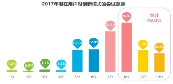 潛在用戶對(duì)創(chuàng)新模式的嘗試意愿較高,嘗試意愿在8分及以上的用戶占比接近一半。