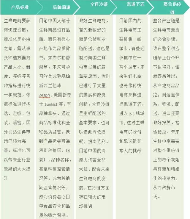 線上線下融合成生鮮電商發(fā)展重要趨勢(shì);圍繞零售核心,優(yōu)勢(shì)痛點(diǎn)互補(bǔ);各種渠道的融合是發(fā)展的必然趨勢(shì)。