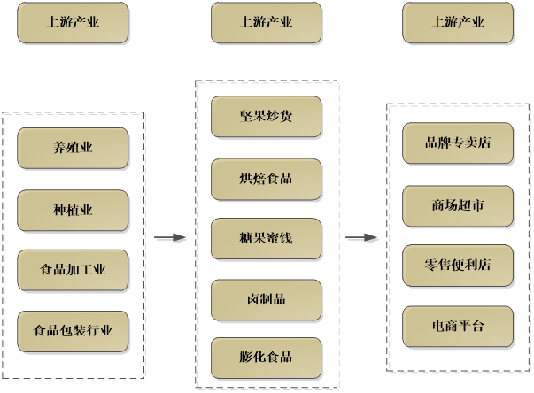 休閑食品行業(yè)的上游行業(yè)包括傳統(tǒng)農(nóng)業(yè)如種植業(yè)、養(yǎng)殖業(yè)、,食品添加劑、食品包裝行業(yè)。行業(yè)的下游主要是銷售環(huán)節(jié),通過多種渠道如大型商超、直營店、經(jīng)銷商等進行銷售,直面產(chǎn)品終端消費者。