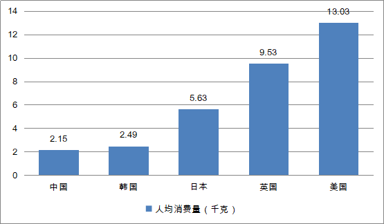 橫向?qū)Ρ任覈c世界其他發(fā)達國家休閑食品人均消費額、消費量可以發(fā)現(xiàn),盡管近年來中國休閑食品市場增長較快,但與發(fā)達國家相比仍有不小的差距,增長空間較大。目前,我國休閑食品人均消費量為2.15千克,較為接近韓國的2.49千克,但與日本(5.63千克)、英國(9.53千克)、美國(13.03千克)相比差距仍較大。