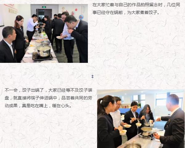 大家分成“愛吃餃子”“會(huì)做餃子”“多彩生活”和“幸?;▋骸彼膫€(gè)組合,展開了包餃子比賽。只見他們熟練的搟面皮、放餡料、捏餃子,十指翻飛之間,剁餡聲、歡笑聲、音樂聲,交織在一起,每個(gè)人臉上都洋溢著燦爛的笑容,公司里充滿了歡聲笑語(yǔ),匯聚成了一片歡樂的海洋。